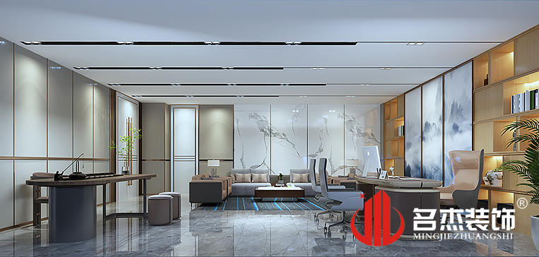 整体空间使用简约时尚的风格,加入圆形和长条形的灯具加入,让办公室装修空间增添了不少的时尚感。部分区域使用了大理石条纹作为背景墙的要素,使得整个总经理室增加了不少的大气稳重感。