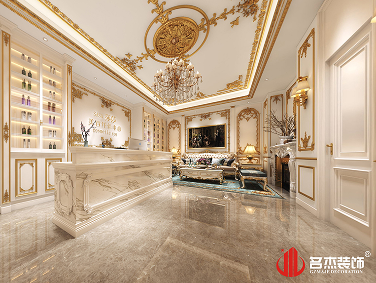在整体的设计当中,设计团队以现代奢华的风格来作为这次的主打风格,以金色作为改纤体中心的点缀色,而且不同造型上使用的颜色也是金色,让空间充满这一种奢华的感觉。在灯具的使用上也是按照奢华的路线走,水晶吊顶,壁灯,营造出优雅、富丽的氛围。#美容装修设计#