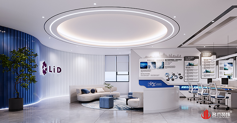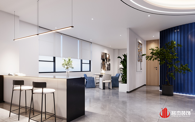整个办公装修设计空间是以时尚简约的风格来作为主打风格的,加入企业LOGO色——蓝色,作为贯穿整个办公装修设计空间的点缀色。前厅的背景墙使用的是一种渐变的手法,让办公装修设计空间变得更有设计感,同时在前厅的吊顶使用圆弧的元素,让办公装修设计空间变得更加有层次感。