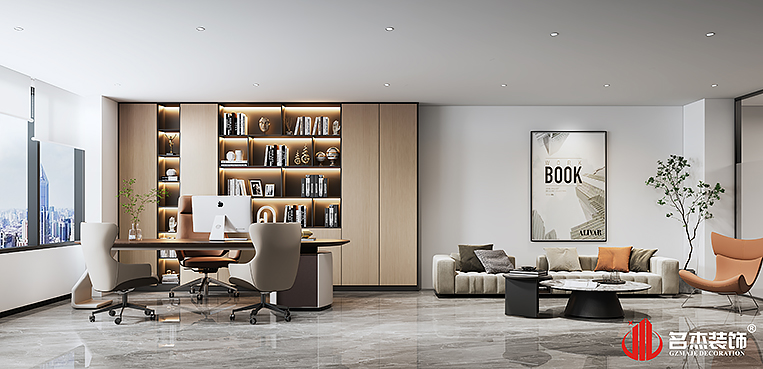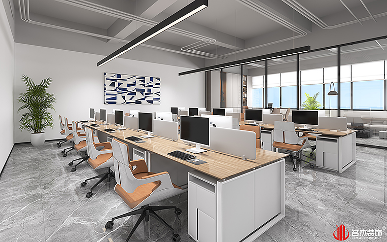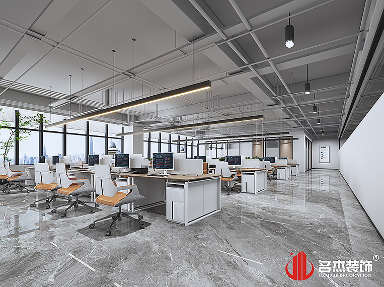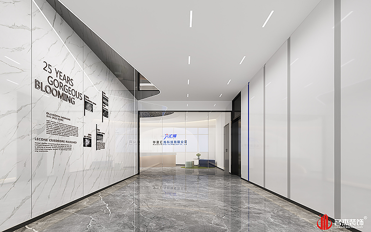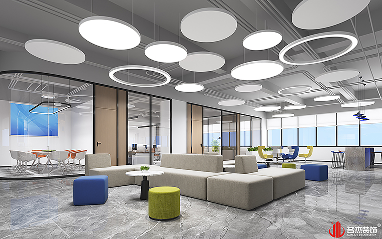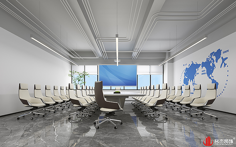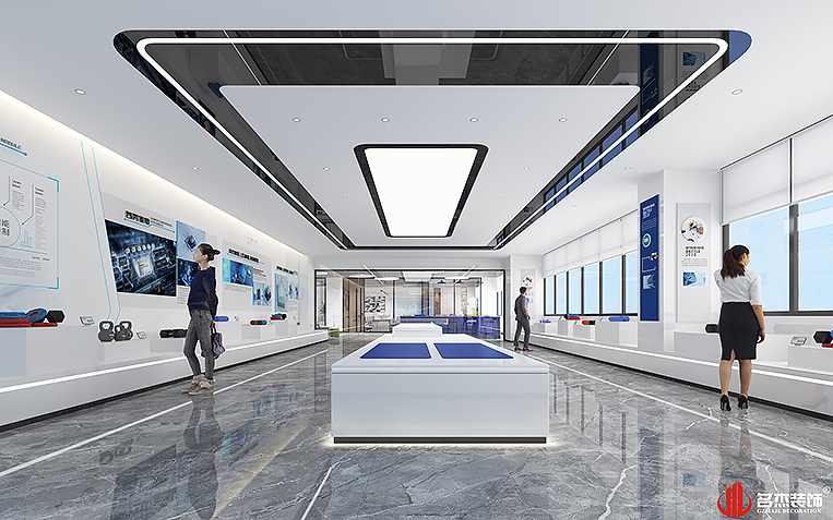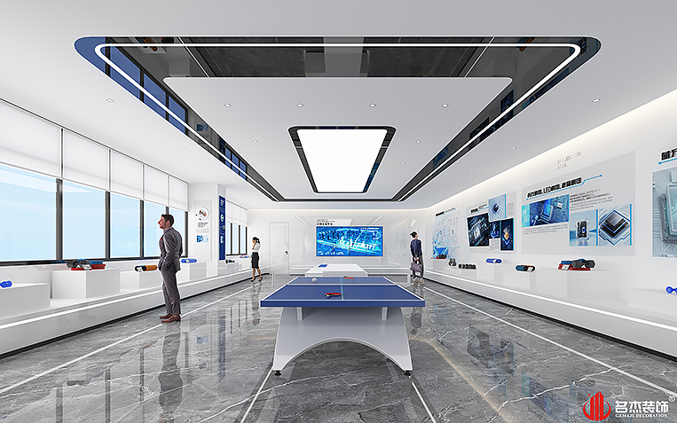 整个办公装修设计空间采用时尚简约的风格,搭配简约的线条灯以及使用亮眼的颜色来进行点缀,让空间简约而不简单。前台区域使用弧形背景墙,加入弧线型元素来增加空间的设计感。而在展厅区域则使用蓝色作为点缀色,搭配方正且有造型的天花,让空间有着浓郁的科技感。#广州办公室装修设计#