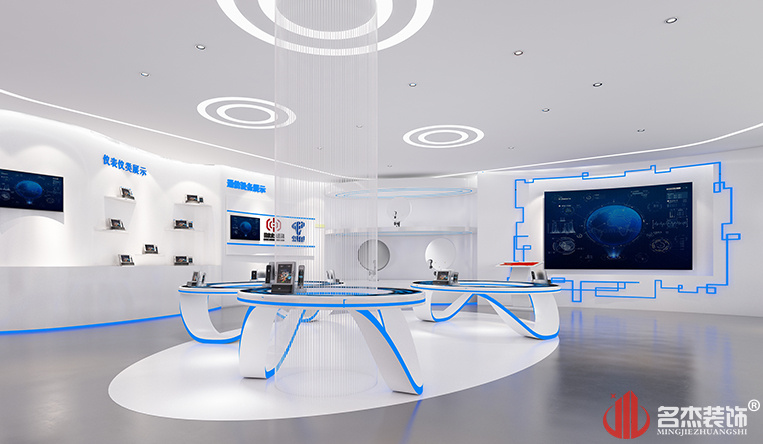 广东机动通信局是电信运营商中一支鲜为人知的队伍,是对整个社会来说不可或缺的;他们保障了各种紧急状况下的通信。设计师根据机动通信局展厅设计的需求及对通信的理解,做出科技感的效果是显而易见的,展厅主要是展示各种通信产品,我们要有高科技视觉感受和方便使用,展厅的设计也要有各种功能性区分设置。